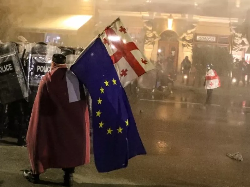 Αργά το απόγευμα, το πλήθος, κρατώντας σημαίες της Γεωργίας και της ΕΕ, βρισκόταν στο κέντρο της πόλης.