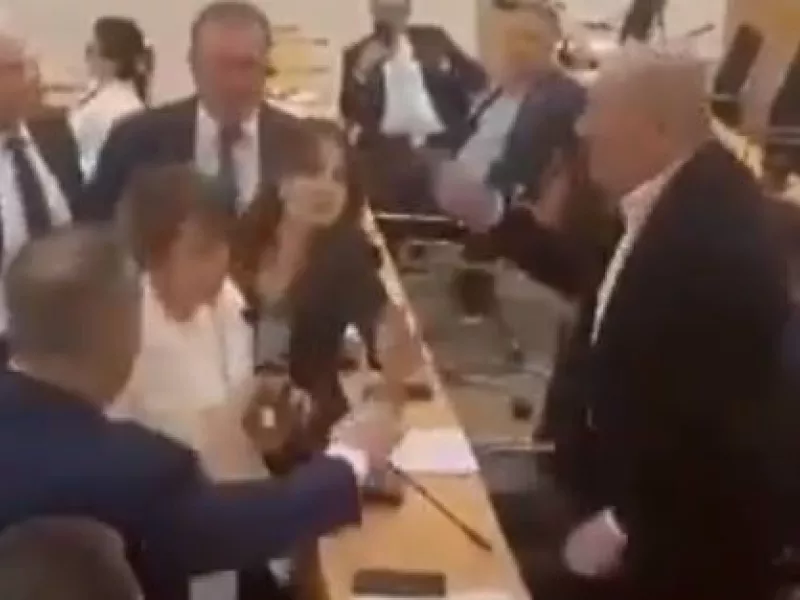 Σε βίντεο που προβλήθηκαν από τοπικά μέσα ενημέρωσης, διακρίνεται η Κάτια Ντεκανοΐτζε, που πρόσκειται στην αντιπολίτευση, να χτυπά στο κεφάλι τον Γκουράμ Ματσαρασβίλι με κάτι που μοιάζει με πλαστικό μπουκάλι, ενώ εκείνος της φωνάζει και της κουνά το δάχτυλο.