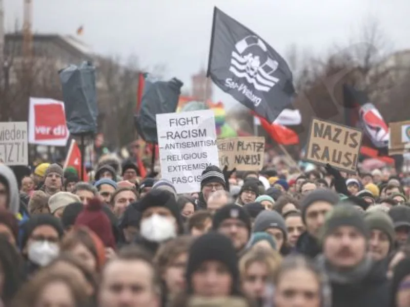 Περισσότερα από 25.000 άτομα διαδήλωσαν νωρίτερα απόψε κατά της Εναλλακτικής για τη Γερμανία (AfD) στην Πύλη του Βραδεμβούργου, στο Βερολίνο, εκφράζοντας την οργή τους μετά την αποκάλυψη ότι τον περασμένο Νοέμβριο στελέχη του κόμματος συναντήθηκαν με εκπροσώπους νεοναζιστικών οργανώσεων προκειμένου να συζητήσουν το «στρατηγικό σχέδιο» δια της βίας απέλασης τουλάχιστον δύο εκατομμυρίων μεταναστών. Ανάλογες διαδηλώσεις πραγματοποιήθηκαν και σε άλλες πόλεις, ενώ σε αυτήν του Πότσνταμ, της εκλογικής τους περιφέρειας, έδωσαν το «παρών» ο καγκελάριος Όλαφ Σολτς και η υπουργός Αναλένα Μπέρμποκ.