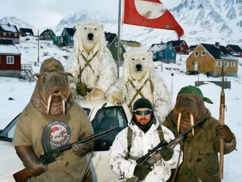 Στο μουσικό βίντεο, δημιουργημένο με Τεχνητή Νοημοσύνη, ονόματι Greenland Defense Front - The Hungry Giant (Γροιλανδικό Μέτωπο - Ο Πεινασμένος Γίγαντας, βλέπε Ντόναλντ Τραμπ) εμφανίζονται οι υπερασπιστές της Γροιλανδίας, άνθρωποι αλλά και... θαλασσιοι ελεφαντες ή πολικές αρκούδες, όλοι με όπλα στα χέρια και έτοιμοι να αντιμετωπίσουν τον Τραμπ.