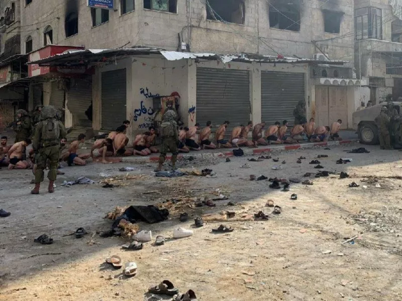 Σε βίντεο και φωτογραφίες που μεταδόθηκαν το απόγευμα από την ισραηλινή τηλεόραση και έκτοτε έγιναν viral στα κοινωνικά δίκτυα, διακρίνονται άνδρες καθισμένοι οκλαδόν, με σκυμμένα κεφάλια, φορώντας μόνο τα εσώρουχά τους.