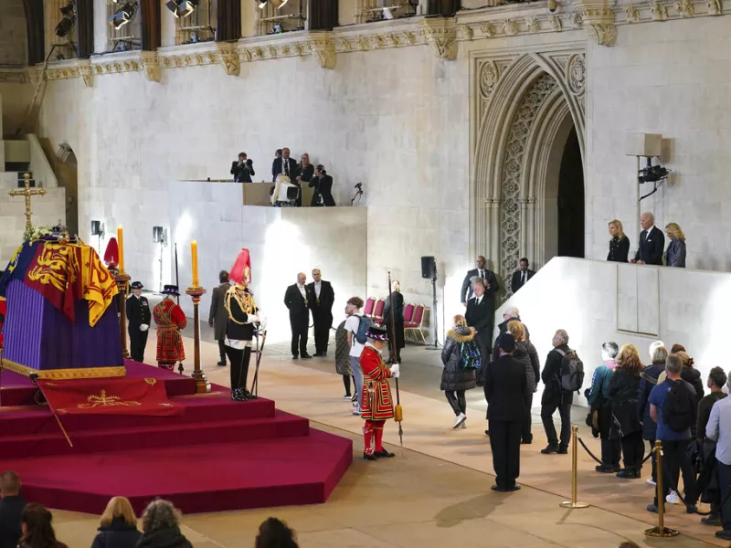 Ο πρόεδρος Μπάιντεν και η σύζυγός του Τζιλ εμφανίσθηκαν σε υπερυψωμένο χώρο μέσα στην αίθουσα του Ουεστμίνστερ όπου βρίσκεται το φέρετρο της βασίλισσας ενώ ουρά ανθρώπων περνούσε μπροστά του. Ο αμερικανός πρόεδρος έκανε το σχήμα του σταυρού και έβαλε το χέρι του στην καρδιά του.
