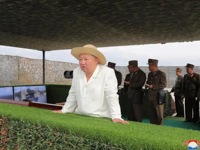 Ο Κιμ ξέφυγε από τη συνηθισμένη… μαύρη ενδυμασία του και φόρεσε ένα λευκό σακάκι (τώρα που έχει αδυνατίσει… ) και ένα καπέλο σε στυλ σαφάρι, ενώ παρακολουθούσε στρατιωτικές ασκήσεις σε μια άγνωστη τοποθεσία στη Βόρεια Κορέα.