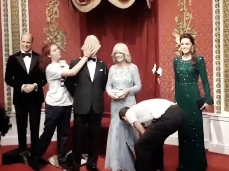 Δυο νεαροί μπήκαν στο μουσείο της Μαντάμ Τισό στο Λονδίνο και έφτασαν μπροστά στα νέα κέρινα ομοιώματα των Καρόλου, Καμίλλας, Ουίλιαμ και Κέητ – δηλαδή του βασιλικού ζεύγους και του διαδόχου του θρόνου.