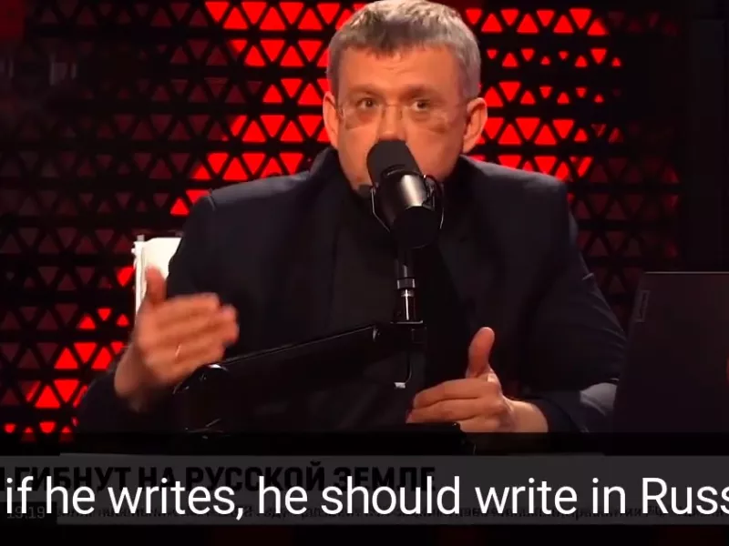 «Αν πρέπει να γράφει (σε ξένη διαδικτυακή πλατφόρμα), να γράφει στα ρωσικά. Στην κρατική ρωσική γλώσσα το καταλαβαίνετε φίλοι των δημόσιων σχέσεων;  Ο πρώην επικεφαλής του κράτους δεν μπορεί να γράφει στα αγγλικά, δεν μπορεί» πρόσθεσε ο Ρώσος προπαγανδιστής.