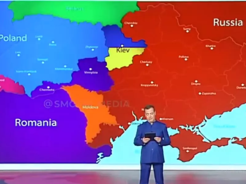 Σε δημόσια διάλεξή του ο Μεντβέντεφ εξαφάνισε σχεδόν όλη την Ουκρανία από το χάρτη (με εξαίερεση το Κίεβο) προσθέτοντας ότι οι αμερικανικές ειδικές δυνάμεις και στρατιωτικοί σύμβουλοι ήδη διεξάγουν πόλεμο στη Ρωσία.