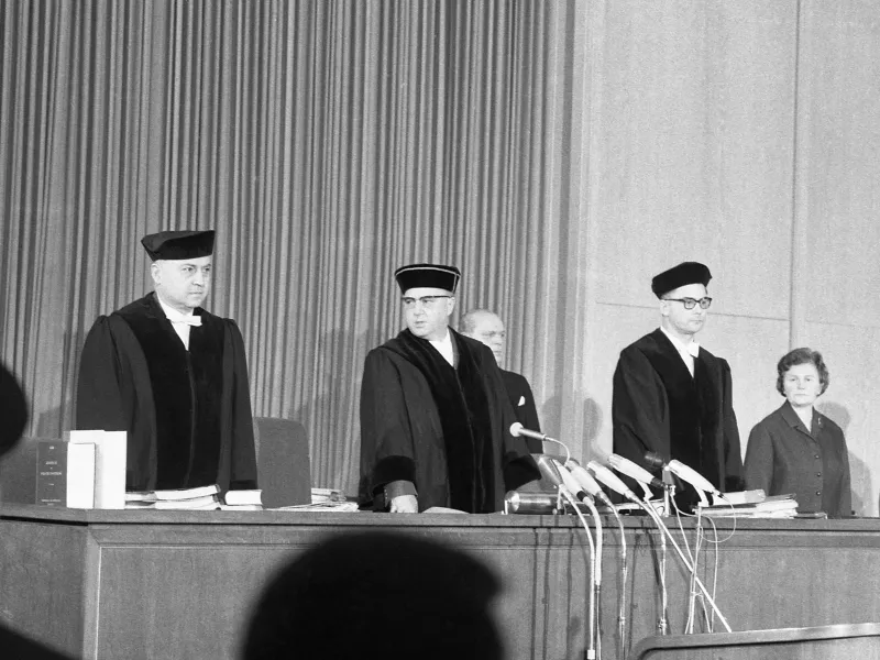 Στον ενάμιση μήνα της δίκης τους, οι είκοσι Ναζί που κατηγορούνταν για εγκλήματα στο Άουσβιτς είδαν να παρελαύνουν μπροστά από το εδώλιό τους περίπου 360 επιζήσαντες του πολωνικού στρατοπέδου εξόντωσης. Πολλοί εξ αυτών επέστρεφαν για πρώτη φορά στη χώρα που τους είχε φυλακίσει και βασανίσει, μόνον και μόνον για να καταθέσουν ενώπιον των ενόρκων τη φρίκη που είχαν βιώσει. Όμως, παρά τις συντριπτικές αποδείξεις που κατέθεσε στο δικαστήριο ο Φριτζ Μπάουερ --ο άνθρωπος που «ξετρύπωσε» τον εγκληματία Άντολφ Άιχμαν-- μόνον έξι κατηγορούμενοι καταδικάσθηκαν σε ισόβια δεσμά, ένδεκα σε κάθειρξη 14 ετών και τρεις απαλλάχθηκαν λόγω έλλειψης αποδείξεων.
