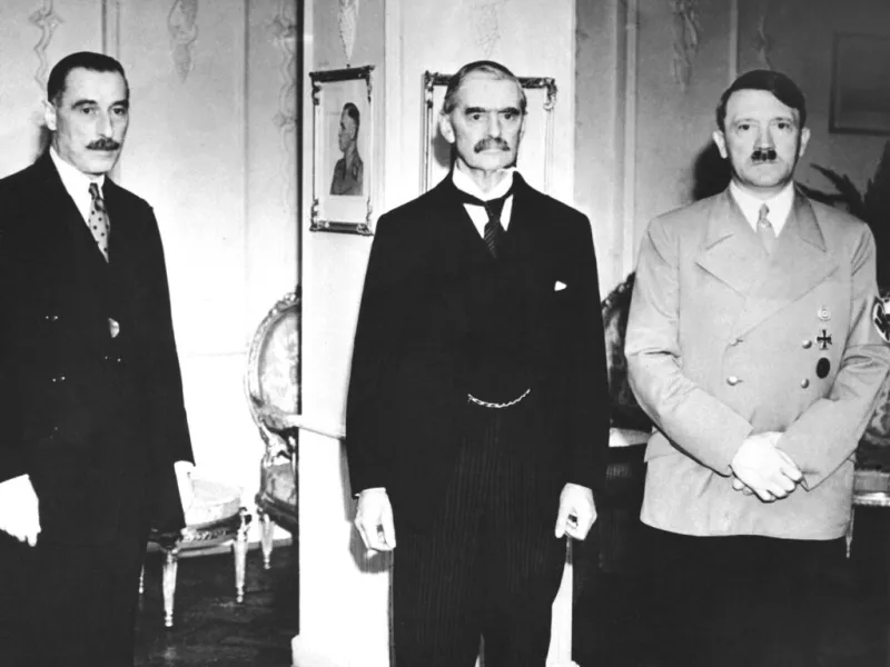 Τον Σεπτέμβριο του 1938, ο Αδόλφος Χίτλερ υποστήριξε ότι η παράδοση της περιοχής των Σουδητών, με πλειοψηφία εθνοτικών Γερμανών, στο Ράιχ θα ικανοποιούσε τις φιλοδοξίες του και θα τερμάτιζε την απειλή πολέμου στην Ευρώπη. Η Γαλλία και η Βρετανία συμφώνησαν και πίεσαν την Πράγα να την αποδεχτεί. Ο Χίτλερ - του οποίου ο λόγος ήταν εξίσου αξιόπιστος με του Πούτιν - διεμήνυσε ότι δεν είχε περαιτέρω εδαφικές φιλοδοξίες.