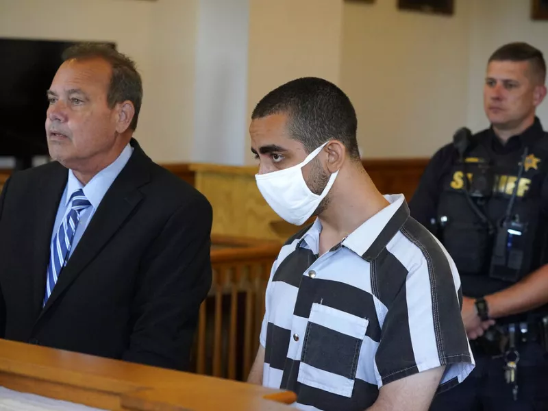 Στη διάρκεια διαδικαστικής ακροαματικής συνεδρίασης στο δικαστήριο της Τσοτόκουα, ο Χάντι Ματάρ, 24 ετών, ο οποίος διώκεται για «απόπειρα φόνου και επίθεση», εμφανίσθηκε με τη μαυρόασπρη ριγέ στολή του καταδίκου, με χειροπέδες και μάσκα και χωρίς να πει λέξη, σύμφωνα με τους New York Times και φωτογραφίες του τοπικού Τύπου.