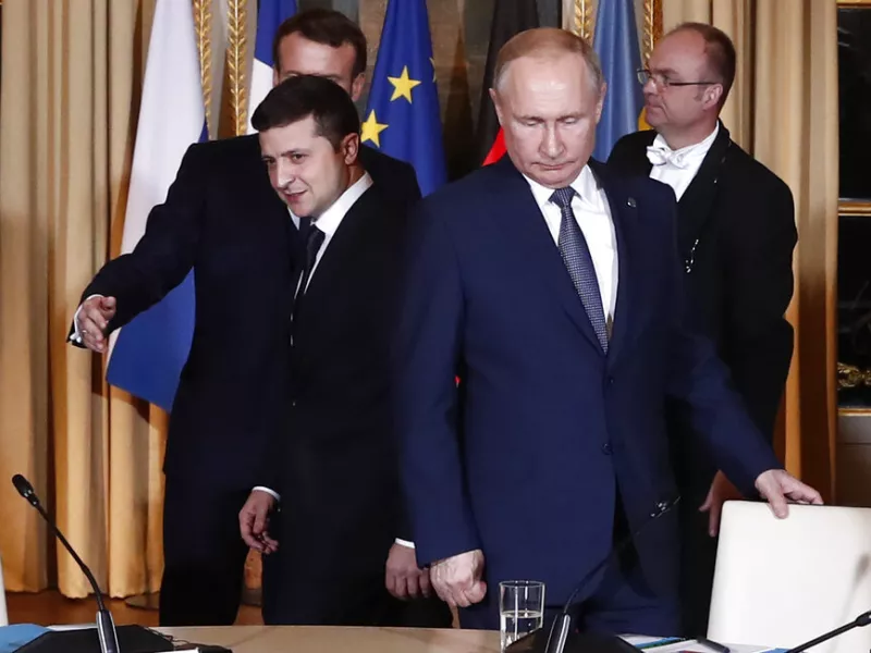 Στην προσπάθεια να τερματίσουν τις μάχες στην περιοχή του Ντονμπάς, οι Ζελένσκι και Πούτιν ταξίδεψαν στο Παρίσι τον Δεκέμβριο του 2019 για τη Σύνοδο Κορυφής Normandy Format - ένα άτυπο φόρουμ που δημιουργήθηκε από Γάλλους, Γερμανούς, Ρώσους και Ουκρανούς διπλωμάτες μετά την έναρξη των συγκρούσεων στο Ντονμπάς.