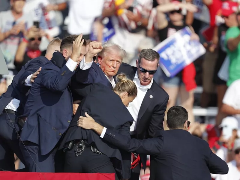 Στην ομιλία που μεταδιδόταν απευθείας, ήταν ορατό αίμα στο δεξί του αυτί. Ο Τραμπ έπεσε στο έδαφος, εμφανώς τραυματισμένος, μετά το πρώτο ξέσπασμα των δυνατών κρότων. Κραυγές ακούγονταν από το συγκεντρωμένο πλήθος και οι άνδρες της ασφάλειας του περικύκλωσαν τον πρώην πρόεδρο και τον οδήγησαν μακριά από την εξέδρα. Ο Τραμπ φαινόταν να φωνάζει προς το πλήθος και χτυπούσε τη γροθιά του καθώς τον απομάκρυναν.
