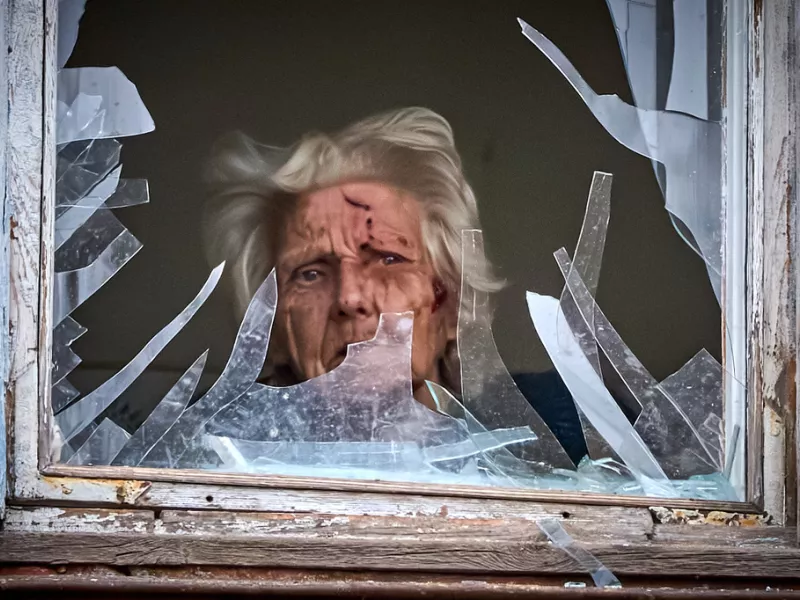 Μια ηλικιωμένη τραυματισμένη γυναίκα κοιτάζει από το σπασμένο παράθυρό της, μετά από την επίθεση ρωσικού drone σε πολυκατοικία στο Κίεβο της Ουκρανίας, την Τρίτη 23 Δεκεμβρίου 2025.