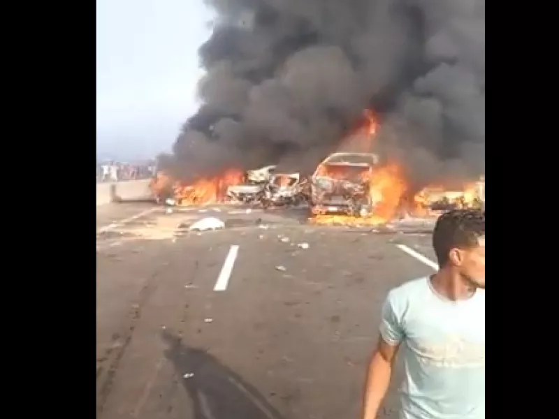 حادثه كبيره علي طريق مصر اسكندرية الصحراوي من حوالي ساعتين، في حوالي 5 او 6 عربيات مولعين