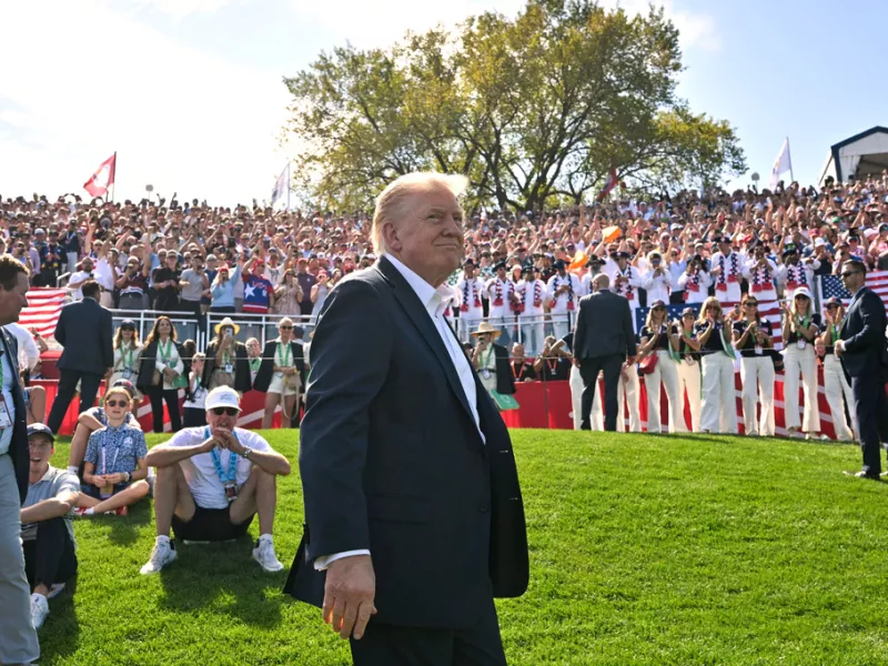 «Θα φύγω για λίγο για να εκπροσωπήσω τις Ηνωμένες Πολιτείες στο Ryder Cup, κάτι που είναι πολύ συναρπαστικό», δήλωσε ο Τραμπ από τον Λευκό Οίκο πριν αναχωρήσει για τη Νέα Υόρκη. Φορώντας λευκά γκολφ παπούτσια και κοστούμι χωρίς γραβάτα, στάθηκε στο πλευρό της εγγονής του, Kai Trump, η οποία σκοπεύει να αγωνιστεί στο γκολφ για το πανεπιστήμιο του Μαϊάμι.