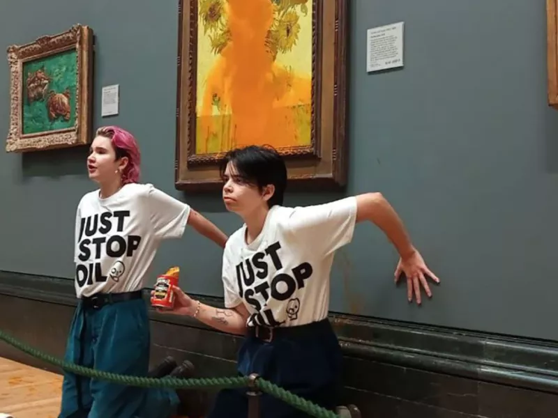 Στην Εθνική Πινακοθήκη του Λονδίνου, δύο ακτιβιστές της οργάνωσης Just Stop Oil πέταξαν την ντοματόσουπα στις 14 Οκτωβρίου, θέτοντας το ερώτημα «Τι αξίζει περισσότερο, η τέχνη ή η ζωή;». Λίγες μέρες αργότερα, ακτιβιστές από την ομάδα διαμαρτυρίας για την προστασία του κλίματος Last Generation πέταξαν πουρέ πατάτας σε έναν πίνακα του Γάλλου ιμπρεσιονιστή ζωγράφου Κλοντ Μονέ στο Μουσείο Μπαρμπερίνι του Πότσνταμ. Ο πίνακας προστατευόταν επίσης πίσω από ένα τζάμι, αλλά η ιστορική κορνίζα υπέστη σοβαρές ζημιές και πρέπει να αποκατασταθεί.