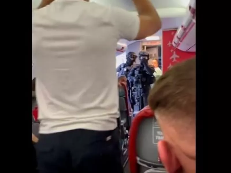 Πρόκειται για τη στιγμή που ένοπλοι αστυνομικοί εισβάλλουν σε αεροπλάνο Jet2 και απομάκρυναν έναν επιβάτη έπειτα από ισχυρισμούς για την ύπαρξη βόμβας στο αεροπλάνο.