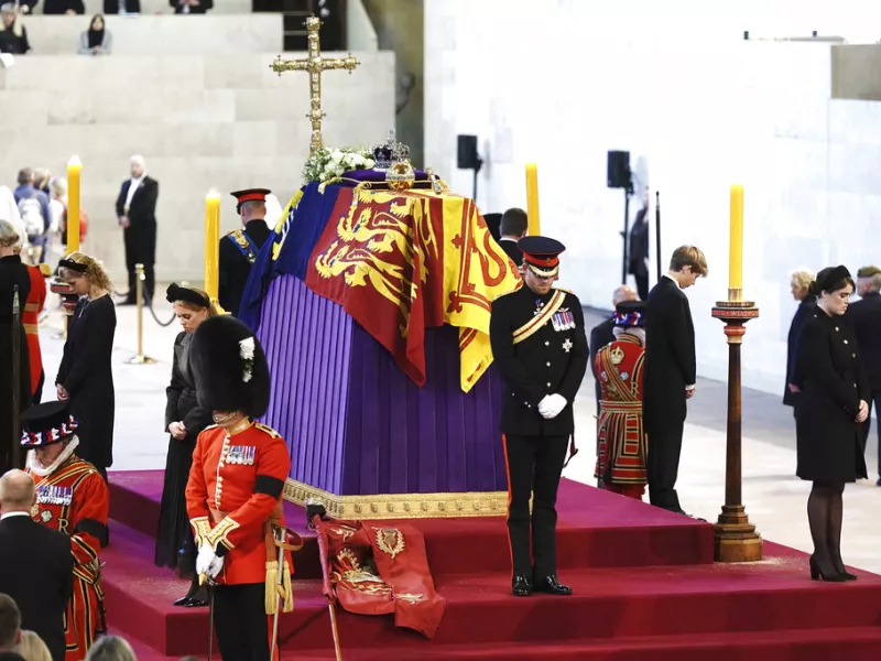 Οι δύο γιοί του βασιλιά Καρόλου Γ' φορούσαν στρατιωτική στολή -ο Χάρι δεν φορούσε πλέον στολή μετά την ηχηρή απομάκρυνσή του από τη μοναρχία-, αντίθετα από τα έξι εξαδέλφια τους. Στάθηκαν για 15 λεπτά με την πλάτη προς το φέρετρο και χαμηλωμένο το κεφάλι, υπό τα βλέμματα των επισκεπτών που έφθαναν για να αποτίσουν ύστατο φόρο τιμής στη σορό της Ελισάβετ Β', η οποία θα παραμείνει εκτεθειμένη σε λαϊκό προσκύνημα μέχρι το πρωί της Δευτέρας.