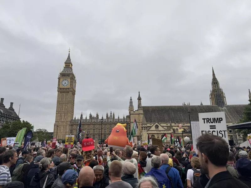 «Οι μετανάστες είναι ευπρόσδεκτοι, ο Τραμπ δεν είναι ευπρόσδεκτος», «Όχι στον ρατσισμό, όχι στον Τραμπ», «Βομβαρδίστε παιδιά στη Γάζα και γιορτάστε στο Ηνωμένο Βασίλειο», ήταν ορισμένα από τα συνθήματα που έγραφαν τα πλακάτ των διαδηλωτών.