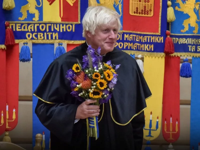Σε τελετή στο Λβιβ, ο πρώην πρωθυπουργός αναγορεύτηκε διδάκτορας του Εθνικού Πανεπιστημίου Ιβάν Φράνκο της πόλης. Ο κ. Τζόνσον απεικονίζεται φορώντας ένα καπέλο και την ακαδημαϊκή του τήβεννο, ενώ κρατά ένα μπουκέτο λουλούδια καθώς λαμβάνει τον τίτλο του «Doctor Honoris Causa» από το πανεπιστήμιο.