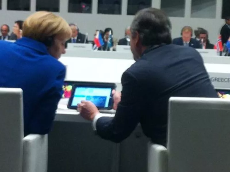 Ο πρωθυπουργός, που καθόταν δίπλα στη γερμανίδα καγκελάριο κατά Σύνοδο Κορυφής Ευρώπης-Ασίας στο Μιλάνο, έδειξε με το τάμπλετ τις φωτογραφίες από τον Τύμβο Καστά στην κ. Μέρκελ.